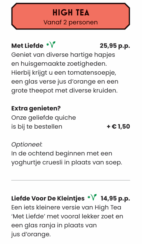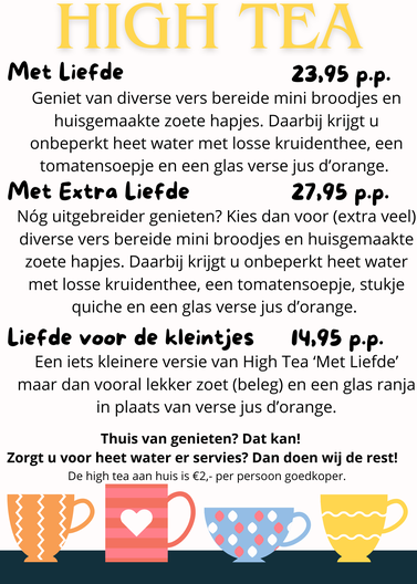 LET OP: Mocht u onverhoopt verhinderd zijn, kan de high tea tot 09:00 uur op de dag zelf geannuleerd worden. Hierna moeten wij helaas, wegens de getroffen voorbereidingen, de high tea in rekening brengen.