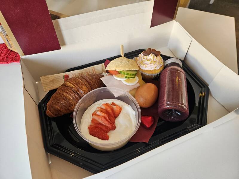 Voor Moederdag, zondag 10 mei, hebben we een heerlijk ontbijtje samengesteld om jouw moeder (of iemand anders waar je gek op bent) mee te verrassen. Het ontbijtje bestaat uit een croissant met jam, belegd broodje, yoghurt met verse aardbeien, gekookt ei, paarse smoothie en een lekkere muffin.